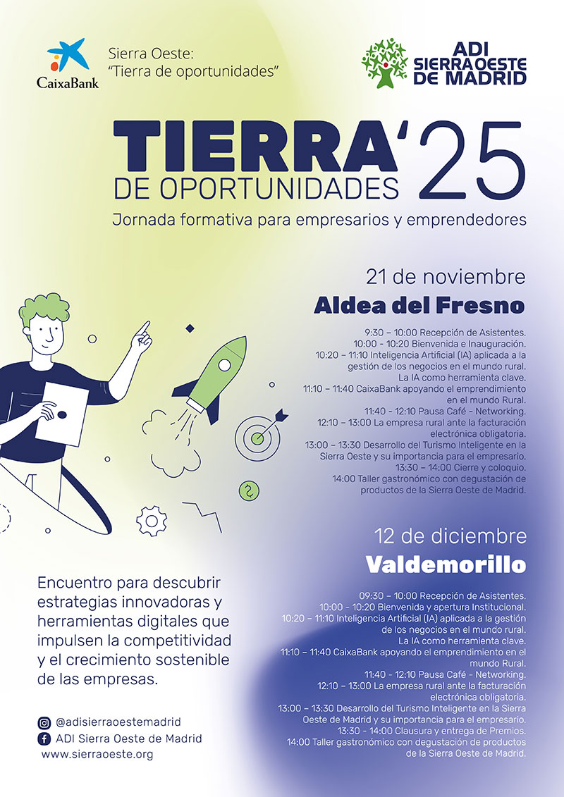 ADI Sierra Oeste de Madrid, en colaboración con CaixaBank celebrará, próximamente, en nuestro territorio dos jornadas formativas sobre emprendimiento rural, dentro del programa Tierra de Oportunidades 2025.