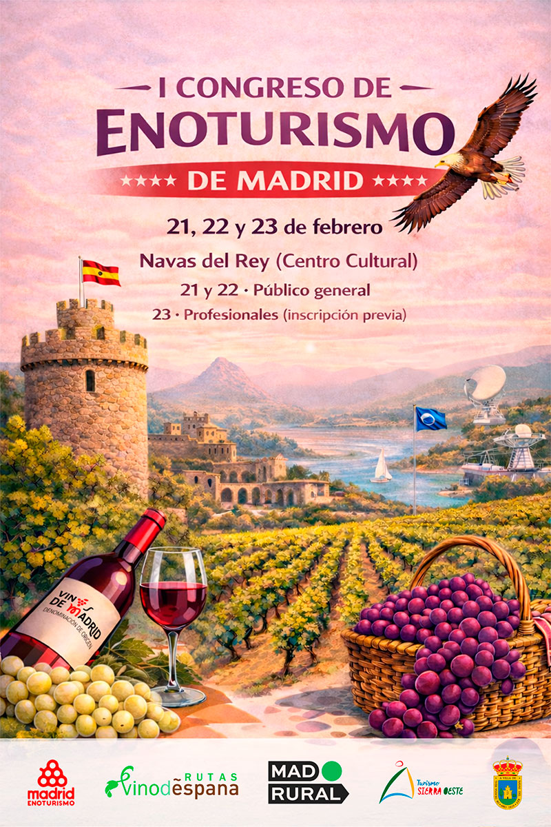 Madrid Enoturismo, MadRural y Turismo Sierra Oeste de Madrid celebran los días 21, 22 y 23 de febrero de 2026 el I Congreso de Enoturismo de Madrid, un encuentro de vocación institucional y estratégica que situará al enoturismo como eje de desarrollo económico, cohesión territorial y valorización del patrimonio vitivinícola regional.