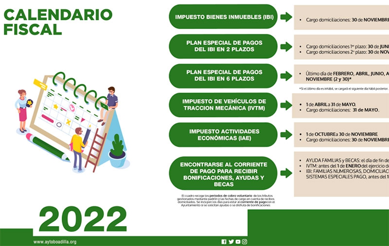 El Ayuntamiento de Boadilla ha publicado el calendario fiscal correspondiente a 2022 para informar a los contribuyentes sobre los periodos de cobro voluntario de los tributos, las fechas en las que se cargan en las cuentas bancarias los recibos domiciliados y aquellas en las que se debe estar al corriente de pago con el Ayuntamiento si se solicitan ayudas o bonificaciones. También pueden conocer los plazos para la solicitud de fraccionamiento del recibo del IBI o las citadas bonificaciones en tributos.