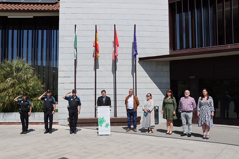El Ayuntamiento de Galapagar ha celebrado hoy, lunes 9 de mayo, el Día de Europa en un acto institucional en la plaza del presidente Adolfo Suárez presidido por el alcalde, Alberto Gómez, acompañado a su derecha por Policía Local de Galapagar y a su izquierda por los siguientes concejales del equipo de Gobierno: Felipe García, Rosa María Encuentra, Ángel Arias, Mercedes Nuño y Pilar García. Además, también estuvo presente en el acto la concejala de Unidas por Galapagar Raquel Almendros.